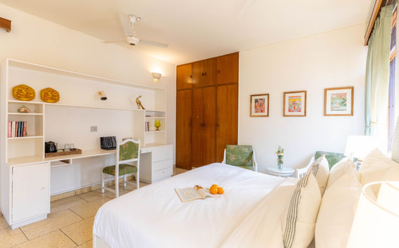 Our aesthetic comes from our memories of palaces in Rajasthan and we bring that comfort to you in this reimagination. This room has a Twin Bed and an attached bathroom. The large window floods the room with natural light and the seating area is perfect for reading after a long day or starting your mornings by sipping some hot chai.